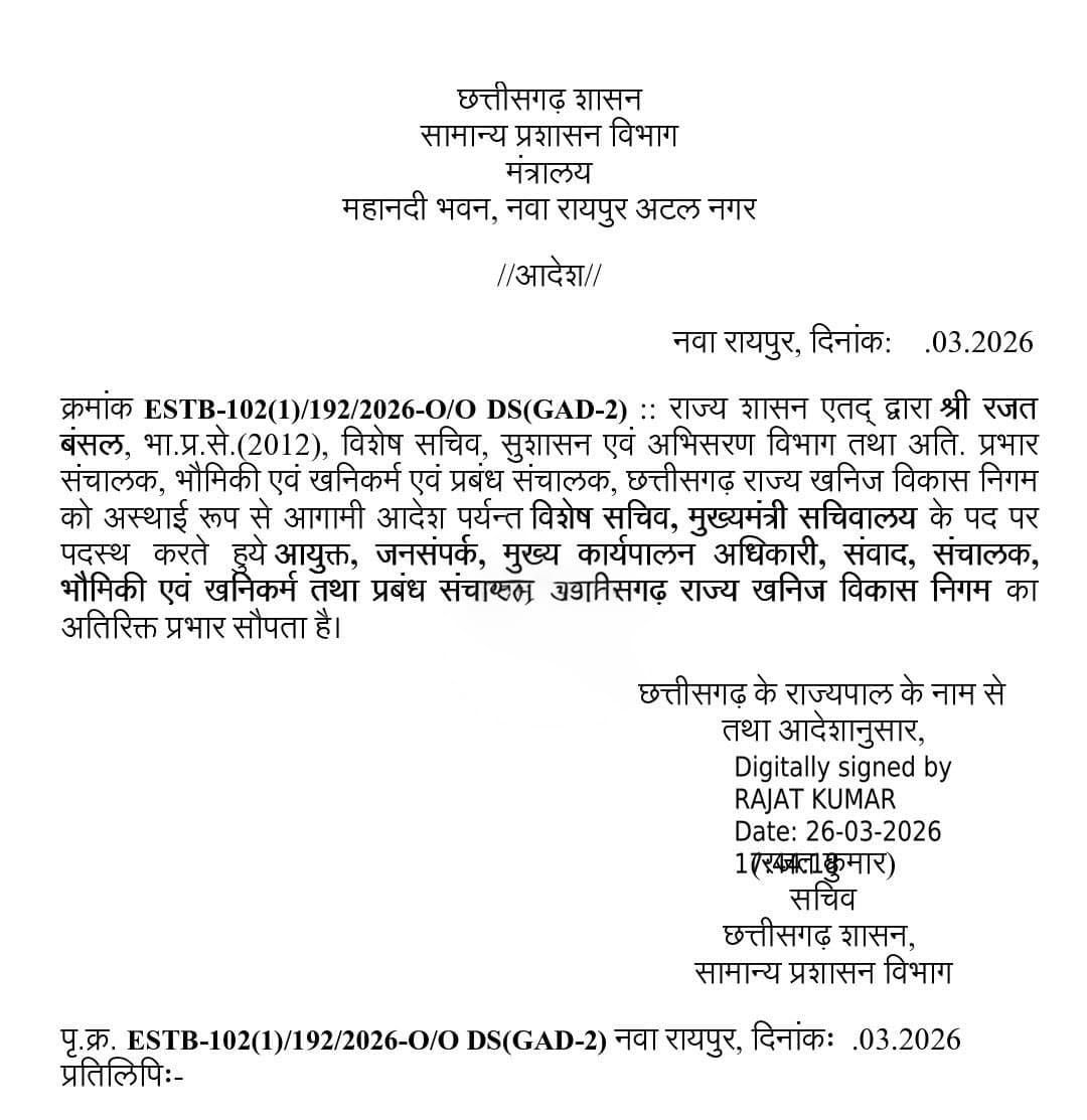 - बड़ी प्रशासनिक सर्जरी : रजत बंसल बने मुख्यमंत्री के नए ‘खास’, जनसंपर्क और संवाद की भी कमान.. - March 26, 2026