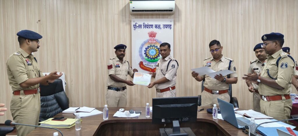 समीक्षा बैठक के दौरान उत्कृष्ट कार्य करने वाले पुलिसकर्मियों को प्रशस्ति पत्र देकर सम्मानित किया गया। थाना कोतवाली के आरक्षक लोमेश सिंह राजपूत और प्रदीप मिंज को ओडिशा (झारसुगुड़ा) से मारपीट के आरोपी की गिरफ्तारी, जूटमिल थाना के प्रधान आरक्षक वीरेंद्र भगत, आरक्षक परमानंद पटेल और महिला आरक्षक आशा सिदार को 17 वर्षीय बालिका को जबलपुर (मध्यप्रदेश) से दस्तयाब करने, प्रधान आरक्षक मोहम्मद दिलदार कुरेशी और आरक्षक लखेश्वर पुरसेठ को हीरो होंडा शोरूम से नगदी की शत-प्रतिशत बरामदगी, तमनार थाना के प्रधान आरक्षक बनारसी लाल सिदार और हेमंत पात्रे को उड़ीसा से गुम महिला की दस्तयाबी, घरघोड़ा थाना क्षेत्र में हत्या के मामले में 3 घंटे में आरोपी की गिरफ्तारी में सराहनीय भूमिका निभाने वाले प्रधान आरक्षक पारसमणी बेहरा और आरक्षक हरीश पटेल, तथा कापू थाना क्षेत्र की गुम बालिका को झारखंड से बरामद कर लाने में उल्लेखनीय योगदान देने वाले प्रधान आरक्षक मनोज सिंह, आरक्षक संजीव पटेल एवं विक्रांत भगत को प्रशस्ति पत्र प्रदान कर उनका उत्साहवर्धन किया गया। बैठक में एडिशनल एसपी आकाश मरकाम, नवपदस्थ सीएसपी मयंक मिश्रा, एसडीओपी खरसिया/सायबर सेल अनिल विश्वकर्मा, एसडीओपी धरमजयगढ़ सिद्धांत तिवारी, ट्रैफिक डीएसपी उत्तम प्रताप सिंह तथा सभी थाना, चौकी प्रभारी उपस्थित रहे ।