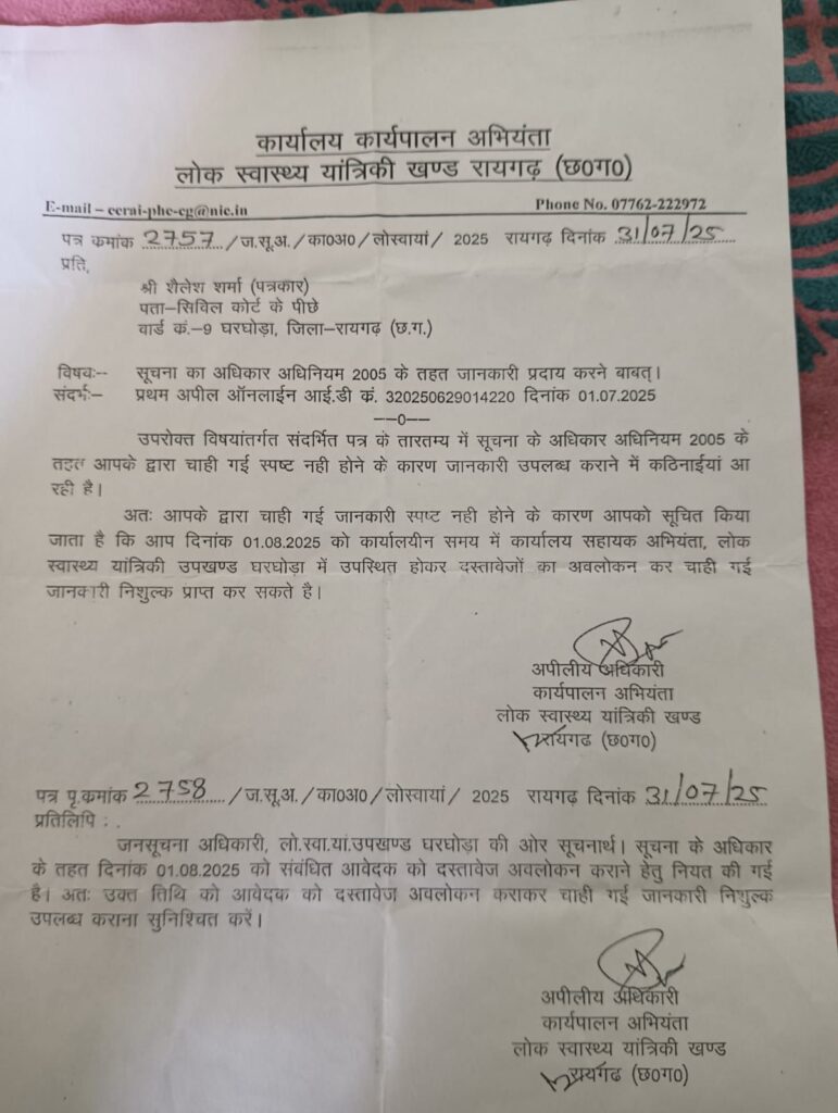 आखिर छुपाना क्या चाहते हैं अधिकारी? – जब RTI अधिनियम साफ कहता है कि मांगी गई जानकारी 30 दिनों के भीतर देना अनिवार्य है, तब भी घरघोड़ा PHE विभाग टालमटोल क्यों कर रहा है? सवाल यह उठता है कि-
