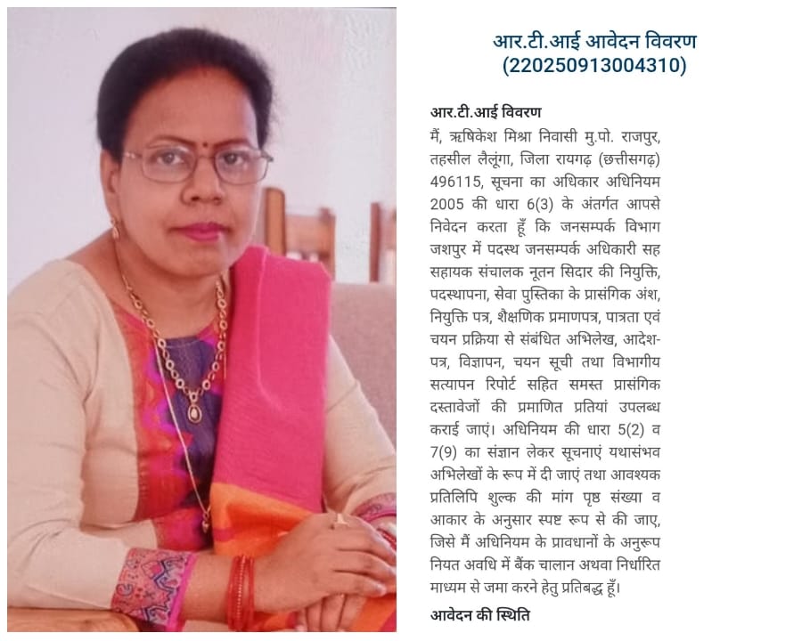 रायगढ़। जशपुर जिले में पदस्थ जनसम्पर्क अधिकारी सह सहायक संचालक नूतन सिदार की नियुक्ति अब बड़े विवाद में घिरती नजर आ रही है। नियुक्ति प्रक्रिया पर गंभीर सवाल उठाते हुए वरिष्ठ पत्रकार ऋषिकेश मिश्रा ने सूचना का अधिकार अधिनियम 2005 के तहत विभाग से पूरी फाइल तलब कर दी है।