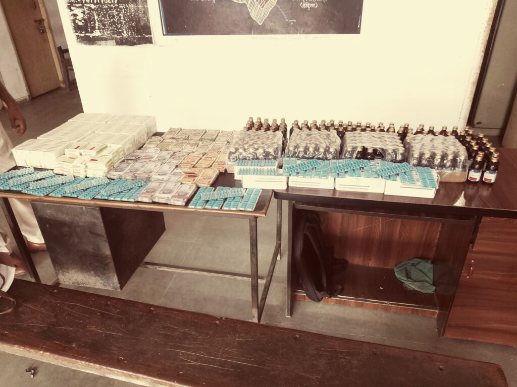 प्रतिबंधित नशीली कफ सिरप, दर्द निवारक गोलियों, इंजेक्शन का जखीरा और नगदी समेत 9 लाख से अधिक की बरामदगी