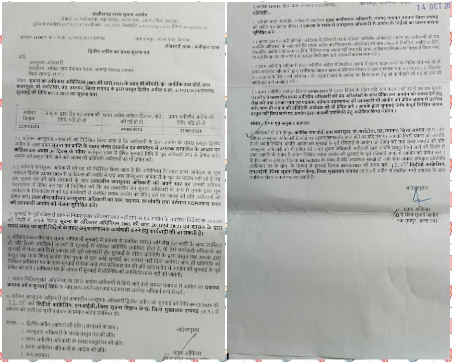 सुनवाई की तारीख तय : आयोग ने इस प्रकरण की द्वितीय अपील की सुनवाई 9 दिसंबर 2025 को वीडियो कॉन्फ्रेंसिंग के माध्यम से जिला सूचना विज्ञान केंद्र, रायगढ़ में निर्धारित की है। अपीलकर्ता और संबंधित अधिकारी दोनों को निर्धारित तिथि पर उपस्थित रहने के आदेश दिए गए हैं।
