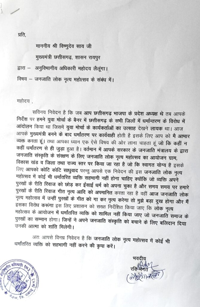 उराँव समाज लैलूँगा इकाई के प्रतिनिधियों द्वारा इस संबंध में राज्य के यशस्वी मुख्यमंत्री श्री विष्णु देव साय जी के नाम ज्ञापन* स्थानीय अनुविभागीय अधिकारी (लैलूँगा) को सौंपा गया है।ज्ञापन में समाज ने करमा पूजा को प्रतियोगिता स्वरूप में मनाने के शासनादेश को तत्काल निरस्त करने तथा इस पर्व की पवित्रता एवं पारंपरिक स्वरूप की रक्षा करने की मांग की है।